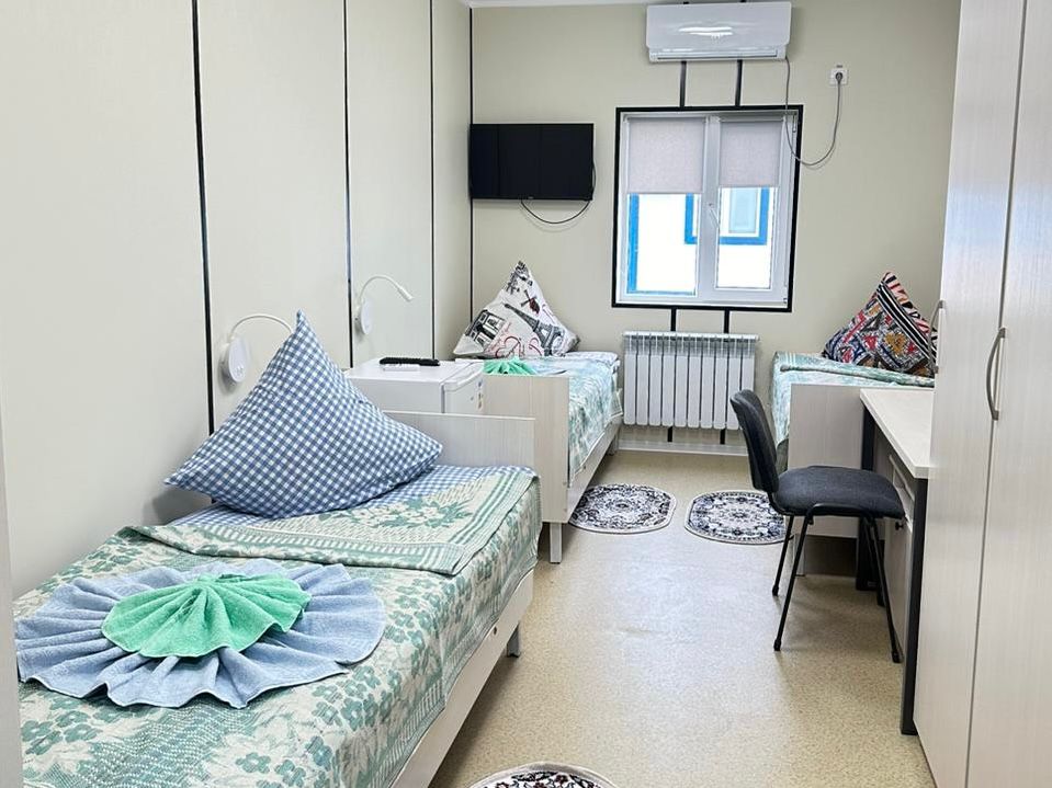 Жатақханаға Бұрғылау және ұңғымаларды жерасты күрделі жөндеу департаментінің жұмысшылары қоныстанады. Модульдік нысан әрқайсысының аумағы 500 шаршы метрге жуықтайтын 4 блоктан тұрады. Ғимарат металл жақтаудан жасалған және «сэндвич» типті сыртқы қабырға панельдерімен қапталған.  Әр блок 3 адам сиятын 16 бөлмеден тұрады. Бөлмелер жарық, жайлы, әрі қажетті техникалармен қамтамасыз етілген. Сондай-ақ мұнда демалыс, санитарлық, техникалық персоналға арналған және қазандық бөлмелері бар.